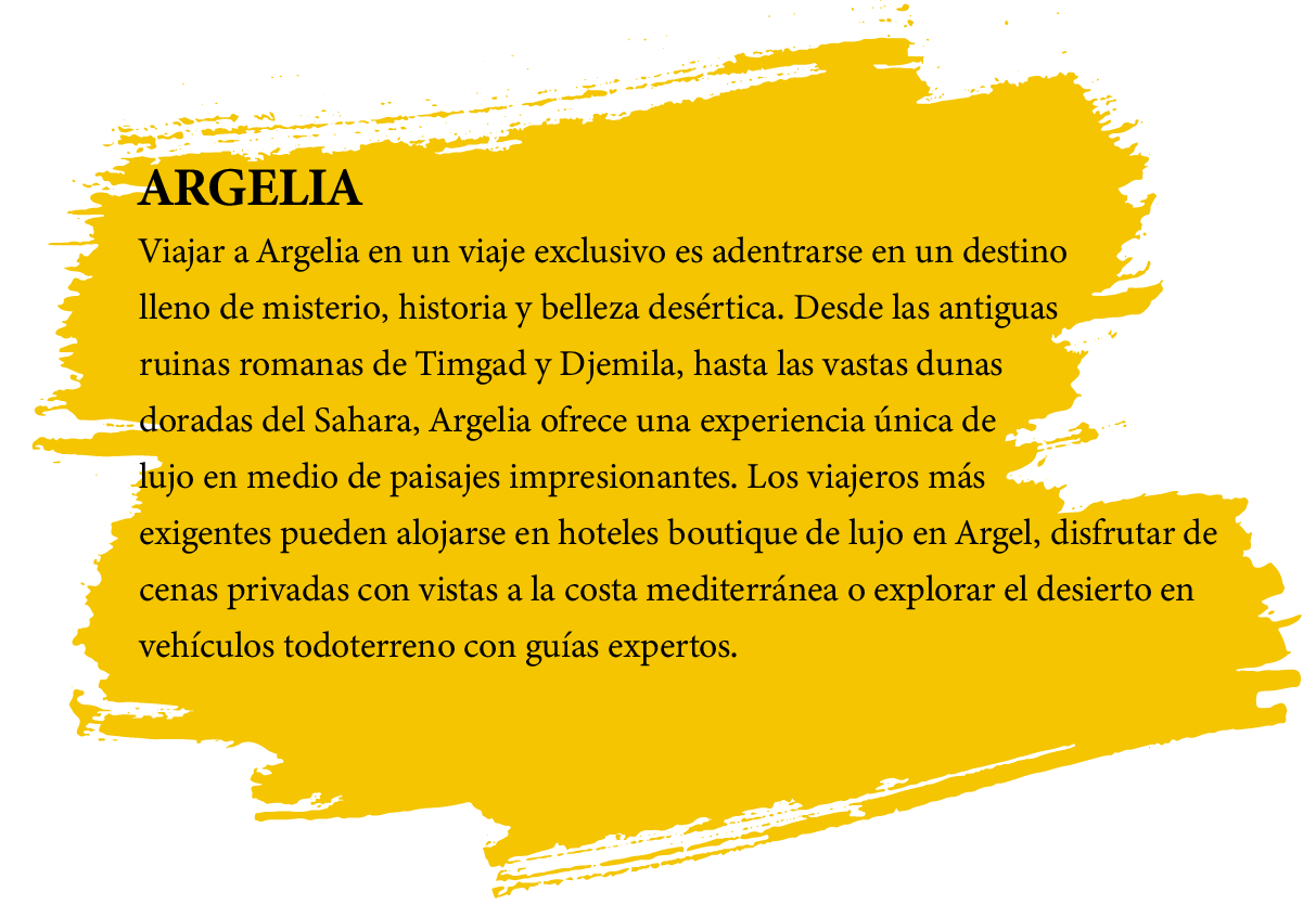 Un viaje exclusivo a Argelia es descubrir un país intacto, donde el lujo se encuentra con la historia más profunda del desierto. Recorres las ruinas romanas de Timgad en visitas privadas, sin multitudes, guiado por expertos locales. Te alojas en campamentos de lujo bajo las estrellas del Sáhara, rodeado de dunas doradas. Disfrutas cenas bereberes preparadas solo para ti, con música tradicional y fuego bajo el cielo abierto. Argelia te sorprende con su autenticidad majestuosa y una elegancia silenciosa que muy pocos han explorado.