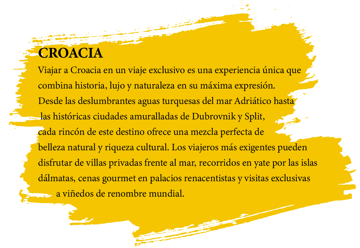 Despertar frente al Adriático en una villa privada en Dubrovnik, rodeado de historia y mar turquesa, es solo el inicio. Navegas en yate por islas como Hvar y Korčula, con paradas en calas secretas y viñedos boutique. Un guía local te abre las puertas de palacios y fortalezas medievales en visitas privadas al atardecer. Cada comida es una experiencia gourmet al aire libre, con mariscos frescos y vinos locales. Croacia, en su versión más exclusiva, combina elegancia, naturaleza y autenticidad con un ritmo profundamente relajado.