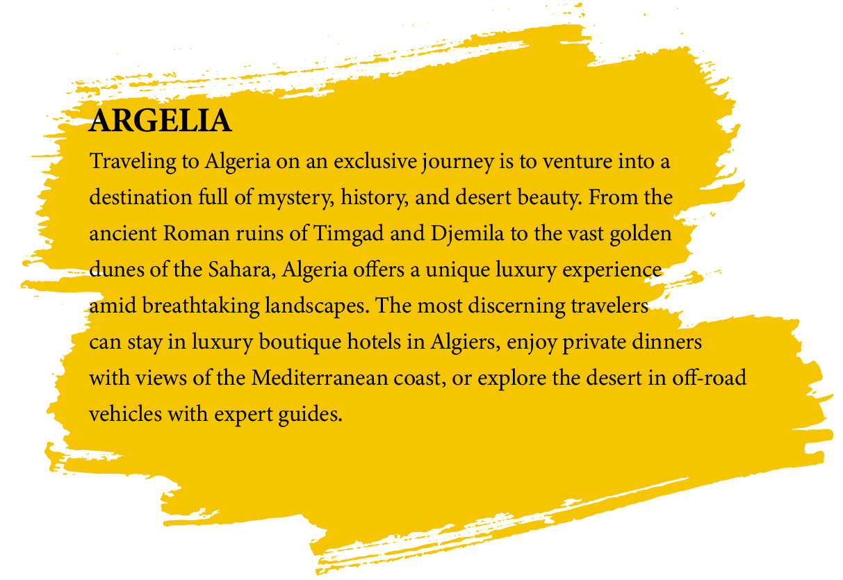 An exclusive journey to Algeria reveals an untouched land where luxury meets the deep history of the desert. Explore the Roman ruins of Timgad on private tours, free from crowds and guided by local experts. Stay in luxury camps beneath the stars of the Sahara, surrounded by golden dunes. Enjoy Berber dinners prepared just for you, with traditional music and fire under the open sky. Algeria surprises with majestic authenticity and a quiet elegance few have ever experienced.