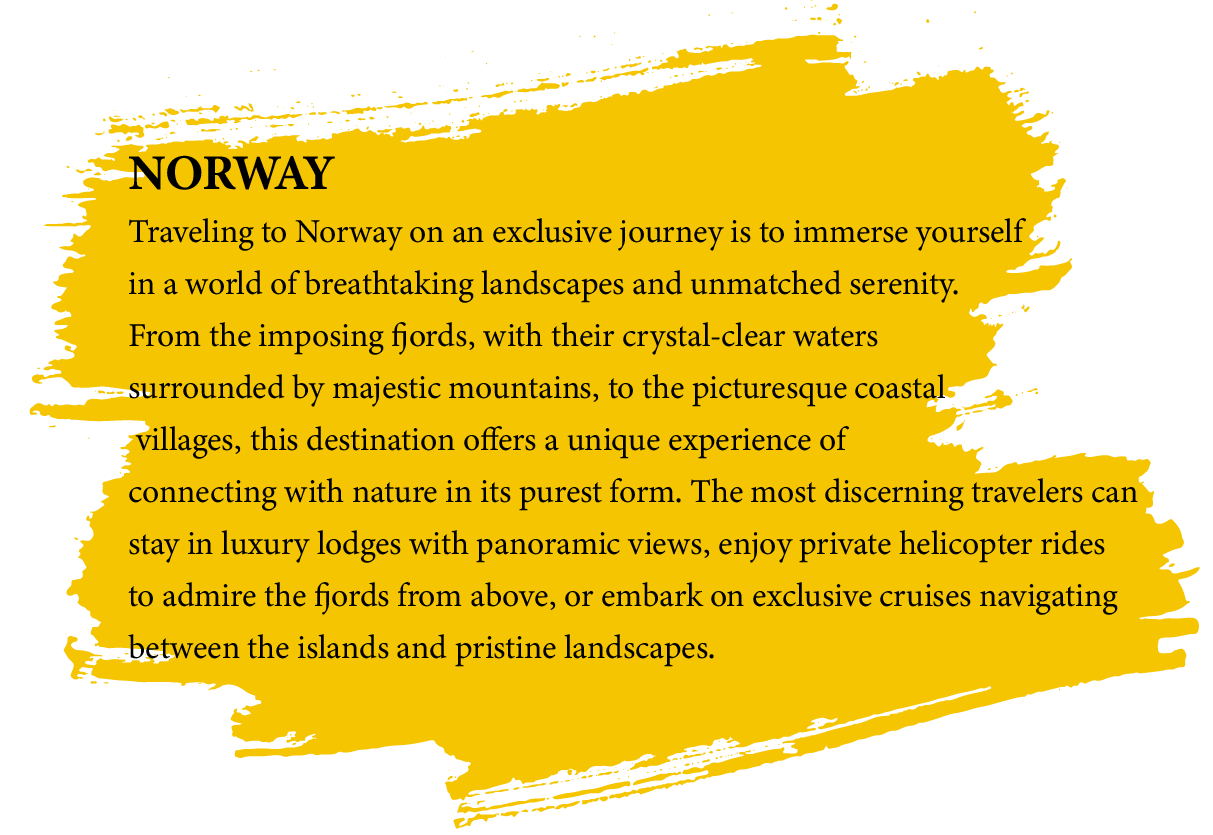 Exploring Norway on an exclusive journey means immersing yourself in dreamlike landscapes where majestic fjords meet the sky. Stay in luxury lodges by the water, with views of the midnight sun or the northern lights, depending on the season. Cruise through dramatic fjords on a private yacht and reach remote glaciers by helicopter. Enjoy gourmet dining with Nordic ingredients, served in breathtaking, secluded settings. Norway surrounds you with natural elegance, absolute serenity, and experiences crafted just for you.