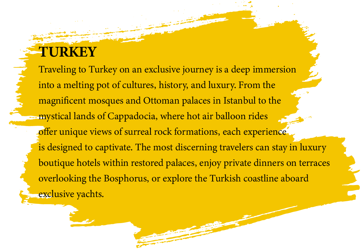 An exclusive journey to Turkey is an immersion into a land where ancient history blends seamlessly with modern luxury. Wake up in a boutique hotel overlooking the Bosphorus, then explore Ottoman palaces and private bazaars with a local expert. Float over Cappadocia at sunrise in a hot air balloon, and unwind in a cave suite transformed into a haven of comfort. Dine on hidden terraces with rich Turkish flavors and unforgettable views. Turkey captivates with exotic elegance, refined hospitality, and one-of-a-kind experiences designed just for you.